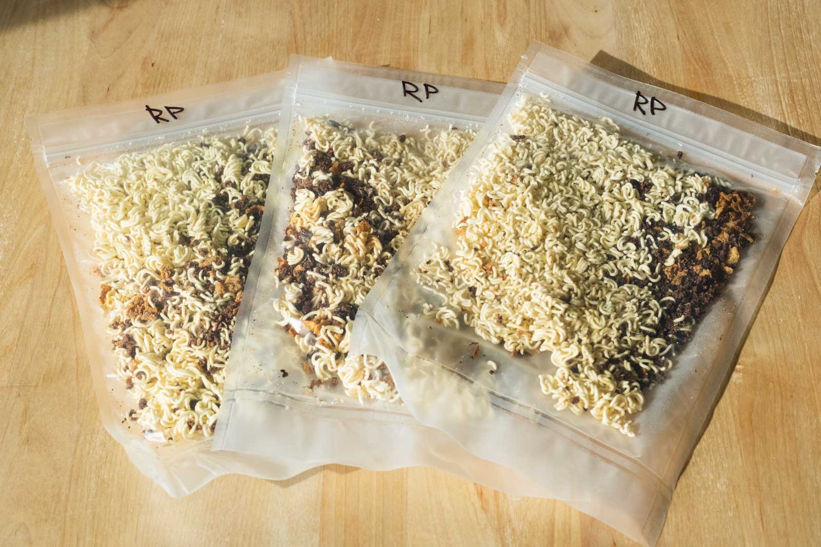 Valmistus: Murskaa pikanuudelit ja laita kaikki ainekset zippivakuumipussiin. Sulje pussi vakuumikoneella. Maastossa kaada pussiin kiehuvaa vettä, sulje hetken ajaksi ja nauti suoraan pussista.